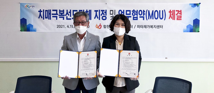 [합천=이영수 기자]합천군은 지난 13일 치매안심센터에서 노인맞춤돌봄서비스 수행기관 ‘미타재가복지센터’와 함께 치매조기검진 및 치매예방관리사업 추진을 위한 치매극복선도단체 지정 및 업무협약을 체결했다.