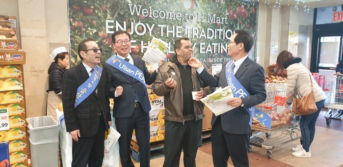 울주배 대미 수출 확대를 위해 미국을 방문하고 있는「울주배 미국수출 판촉 홍보단」은 지난 6일 aT농수산물유통공사 뉴욕지사 방문에 이어 현지 시간 8일 뉴욕 대형유통업체인 H-마트에서 현지인들을 대상으로 울주배 시식 및 홍보·판촉행사를 열었다. <사진 있음>