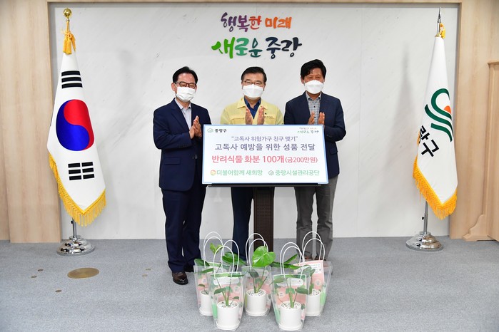 서울 중랑구는 최근 (사)더불어함께 새희망·중랑구시설관리공단으로부터 고독사 예방을 위한 반려식물 100개(200만원 상당)를 전달받았다. 전달받은 반려식물은 초미세먼지 제거에 좋은 ‘몬스테라’로, 구는 중장년 및 홀몸노인 100가구에 배부할 계획이다. 사진은 류경기 구청장(가운데)과 관계자들이 기념촬영을 하는 모습. (사진제공=중랑구청)