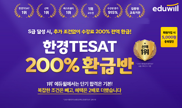 [시민일보 = 여영준 기자] 종합교육기업 에듀윌(대표 박명규) 한경TESAT(테셋)이 오는 8월 14일로 예정된 제68회 시험의 효율적인 대비와 합격 시 2배의 환급금을 제공하는, ‘200% 환급반’ 과정을 개설했다고 밝혔다.