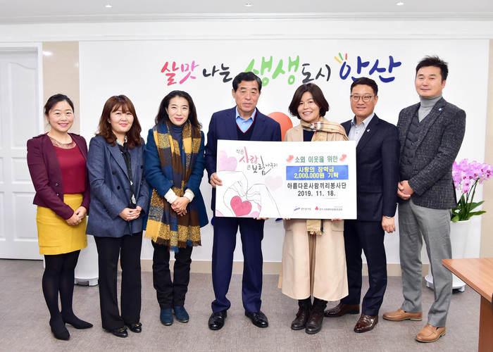 경기 안산시는 18일 ‘아름다운사람끼리’ 봉사단으로부터 저소득가구 청소년을 위한 '사랑의 장학금' 200만원을 기탁받았다. 사진은 이날 시장식에서 열린 기탁식에서 윤화섭 시장(가운데)과 봉사단원들이 기념촬영을 하는 모습. (사진제공=안산시청)