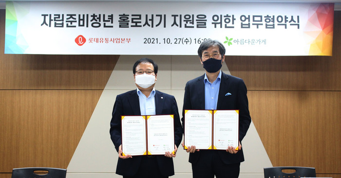 롯데유통사업본부는 지난 27일 김용기 대표와 재단법인 아름다운가게(이하 ‘아름다운가게’)의 윤여영 상임이사 등이 참석한 가운데 자립준비청년의 홀로서기를 지원하고자 양질의 일자리를 창출하고 취업 기회를 제공하는 업무협약을 체결했다고 밝혔다.