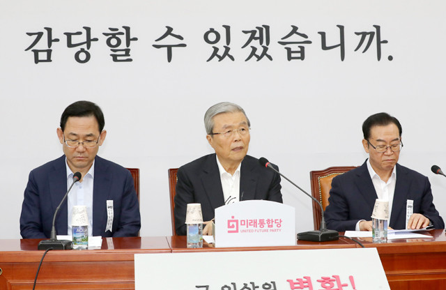 미래통합당 김종인 비상대책위원장(가운데)이 3일 오전 서울 여의도 국회에서 열린 비상대책위원회의에서 발언하고 있다.