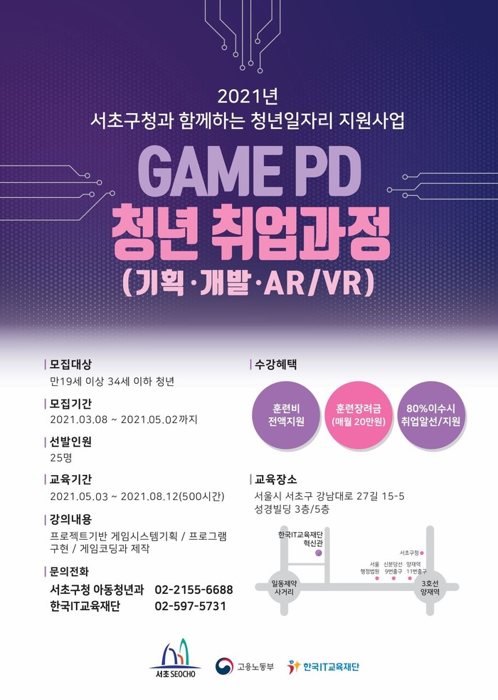 고용노동부와 ‘2021년 지역·산업 맞춤형 일자리 창출 지원사업’ 관련 약정을 체결하고 진행하는 ‘게임PD 청년취업과정’은 서초구의 대표적인 4차산업 청년취업지원 프로그램으로 교육 후 수료생들을 수요기업에 연계 해주는 사업이다.