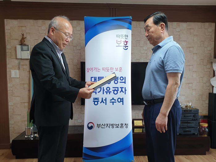 부산지방보훈청(청장 권율정)은 19일 목요일 오후 3시 참전유공자 이 모(사하구, 71세) 어르신 댁을 방문해 ‘찾아가는 대통령 명의 국가유공자 증서 수여식’을 개최했다고 밝혔다.