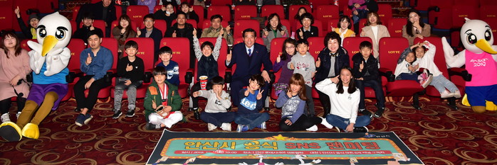 경기 안산시는 17일 롯데시네마 센트럴락에서 공식 사회관계망서비스(SNS) 6개 채널의 구독자 10만명 돌파를 기념하는 팬미팅을 열고 시민들과 소통했다. 사진은 팬미팅에 참석한 윤화섭 시장이 시민들과 기념촬영을 하는 모습. (사진제공=안산시청)
