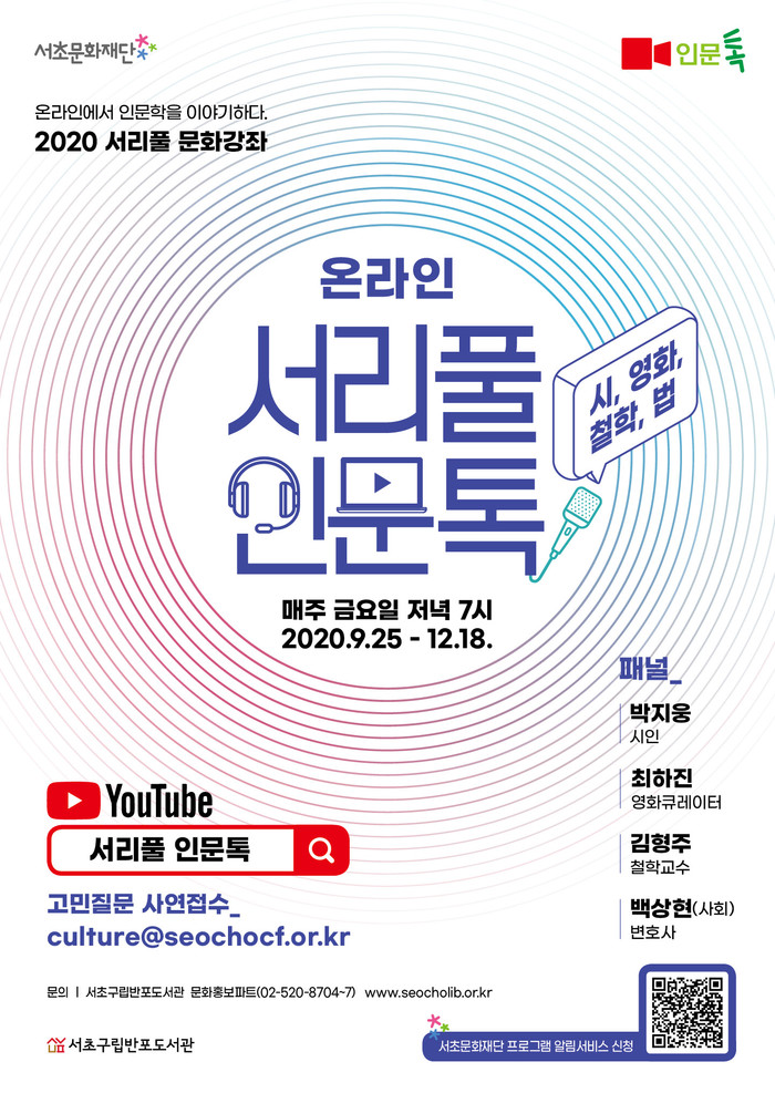 <서리풀 인문톡>은 지역주민의 참여형 인문학 토크쇼로서 생활 밀착 관심사를 인문학적으로 해석해 보고 생각과 아이디어를 공유해 보는 실험형 문화강좌이기도 하다. 시청자들은 영상을 보고 듣는 것에서 그치는 것이 아니라 미리 사연을 접수하여 참여하거나 실시간 댓글로 패널들과 이야기를 나눌 수도 있다. <서리풀 인문톡>은 유튜브 채널 ‘서리풀도서관’에서 실시간으로 방송되며 9월 25일부터 12월 18일까지 총 12회에 걸쳐 매주 금요일 저녁 7시에 만나볼 수 있다.