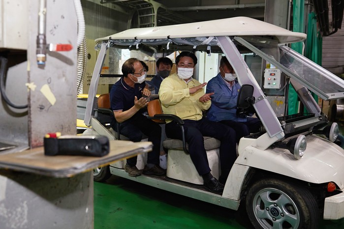 오세현 충남 아산시장은 29일 최근 물류비용 급등에 따른 수출기업의 애로사항을 점검하고자 음봉면에 위치한 (주)대진을 방문했다. 이날 방문은 기업애로를 청취하고 기업 임직원과 근로자를 격려하며 생산시설을 돌아보는 순으로 진행됐다. 사진은 오 시장(가운데)이 회사 생산시설을 둘러보고 있는 모습. (사진제공=아산시청)