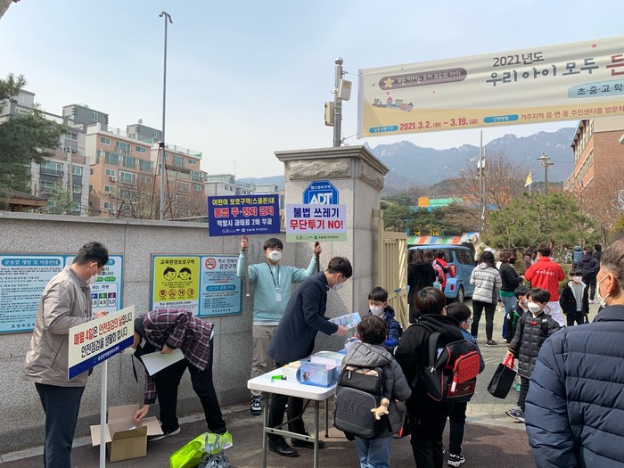경기 의정부 호원2동은 최근 이틀 동안 어린이 보호구역 주차질서 확립 캠페인을 실시해 지역내 초등학교·어린이집 주변 불법 주정차량에 안내문을 부착하고, 피켓 홍보 및 어린이 보호구역 주차금지 안내문을 배부했다. 사진은 지역내 초등학교 앞에서 피켓 홍보를 하는 모습. (사진제공=의정부시청)
