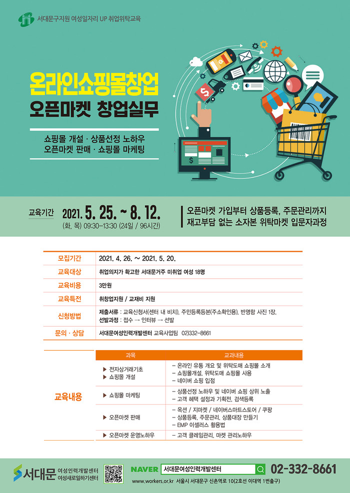 교육 과정은 서대문여성인력개발센터(신촌역로 10 4층)에서 열리며, 서대문구 거주자 중 쇼핑몰 창업을 희망하고 창업의지가 확고한 여성이면 누구나 신청할 수 있다.