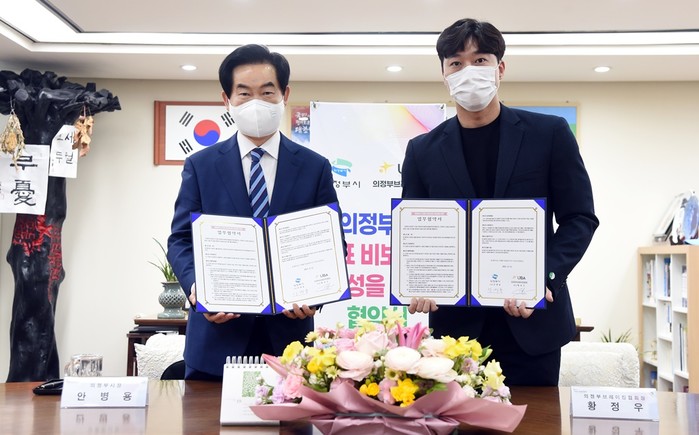 경기 의정부시가 12일 의정부브레이킹협회와 시 대표 비보이단 육성을 위한 업무 협약을 체결했다. 이날 협약에 따라 시와 협회는 오는 2024년 파리올림픽 정식종목으로 채택된 브레이킹 국가대표 배출을 위해 공동 노력하기로 하고 3개년(2021~2023년)간 협력하기로 했다. 사진은 협약 체결 후 안병용 시장(왼쪽)과 협회 관계자가 기념촬영을 하는 모습. (사진제공=의정부시청)