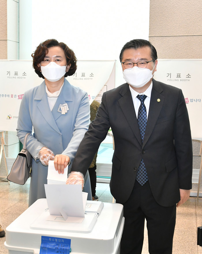 류경기 서울 중랑구청장(오른쪽)과 강영숙 여사가 10일 오전 중랑구청내 설치한 사전투표소에서 '제21대 국회의원선거' 사전투표를 하고 있다.(사진제공=중랑구청)