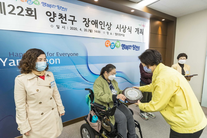 서울 양천구가 최근 ‘제40회 장애인의 날’을 맞아 구청 5층 열린참여실에서 장애인·장애인 복지증진에 기여한 개인·기관·단체를 발굴해 ‘제22회 양천구 장애인상’ 시상식을 개최했다. 사진은 시상을 하며 상패를 수여하고 있는 김수영 구청장의 모습. (사진제공=양천구청)