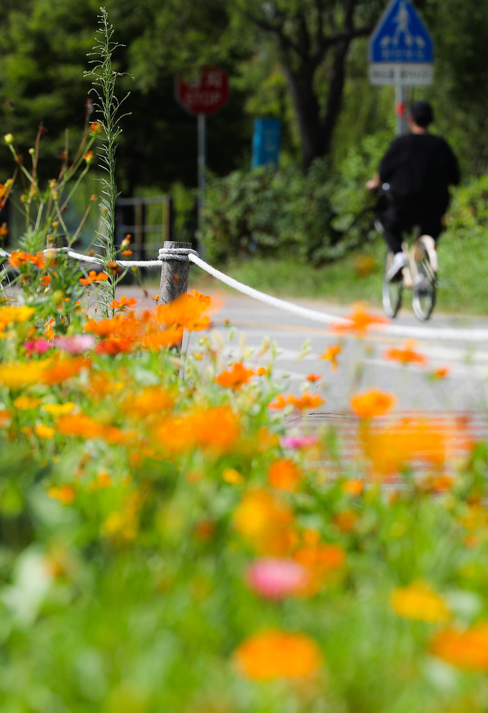 16일 오후 코스모스가 피어있는 서울 여의도 한강공원 자전거도로에서 시민들이 자전거를 타고 있다.