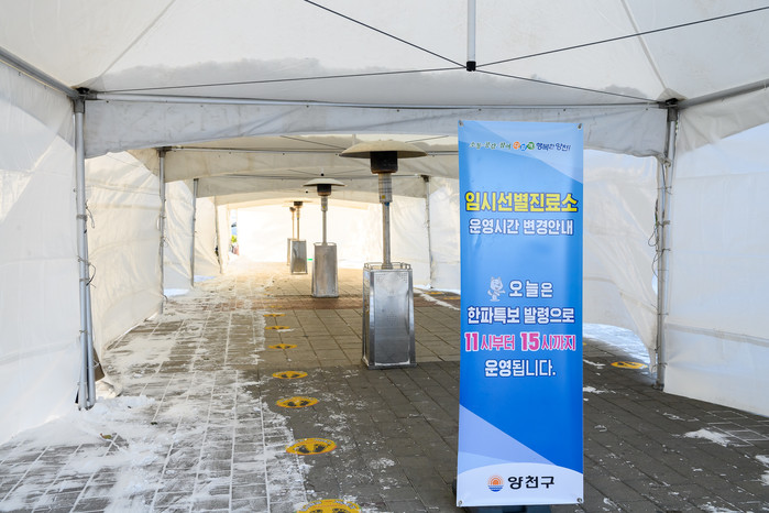 양천구의회 주차장과 신월문화체육센터 주차장 두 곳에 설치된 양천구 임시선별검사소는 평일 오전 9시~오후 5시, 토요일 오전 9시~오후 1시 운영하며, 한파특보(주의보·경보 포함) 발령시 오전 11시~오후 3시로 운영시간을 단축해 운영한다.
