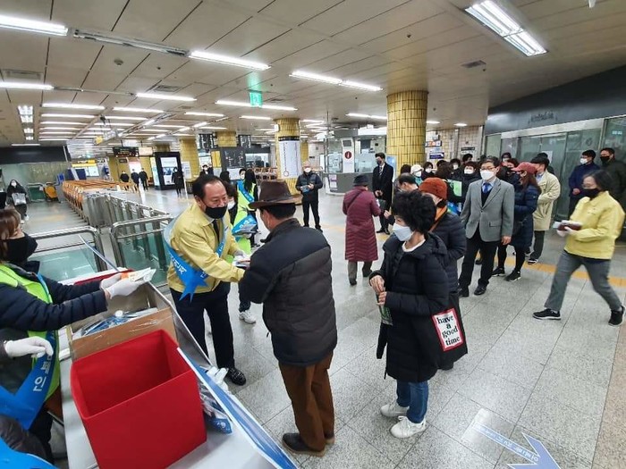 서울 마포구가 최근 공덕역에서 자원봉사자들과 함께 '착한 마스크 나눔 자원봉사 캠페인'을 펼쳤다. 이 캠페인은 마스크가 꼭 필요한 사람들을 위해 보건용 마스크를 면 마스크 등과 교환하는 나눔행사다. 사진은 캠페인에 참여하고 있는 유동균 구청장의 모습. (사진제공=마포구청)