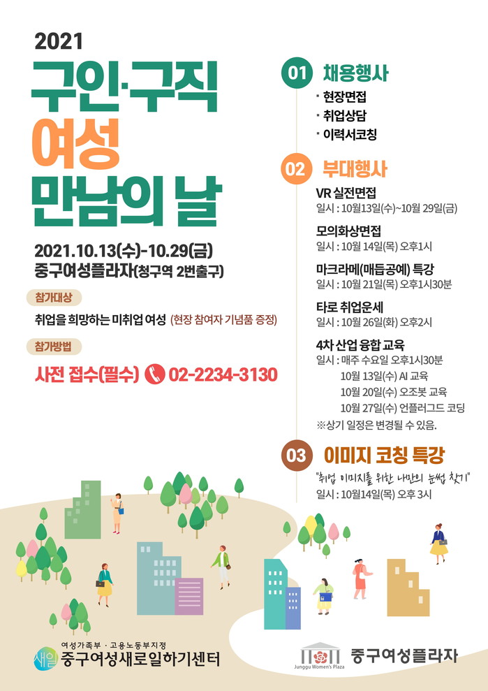부대행사는 구직을 희망하는 여성 누구나 사전 접수를 통해 참여가 가능하다. 자세한 사항은 중구여성새로일하기센터로 문의하면 된다.