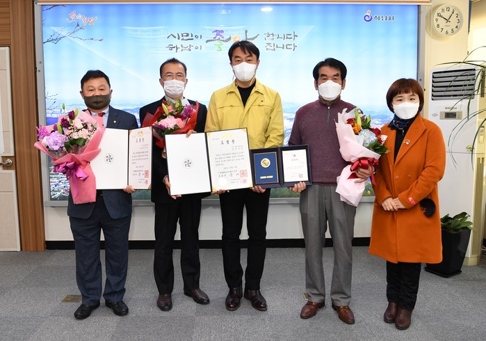 민주평화통일자문회의 경기 하남시협의회가 최근 ‘2020 유공자문위원 표창’ 전수식을 열었다. 이날 전주진 회장과 강성규 수석부회장이 민주평통 의장(대통령) 표창을, 여인철 부회장이 경기도지사 표창을 각각 수상했다. 사진은 표창 전수식에서 김상호 시장(가운데)이 수상자들과 기념촬영을 하는 모습. (사진제공=하남시청)