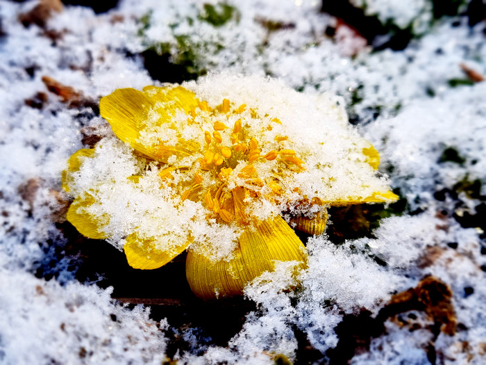 봄의 시작을 알리는 입춘(立春)이 하루 지난 4일, 갑자기 내린 눈 속에 복수초가 고개를 미밀고 있다.