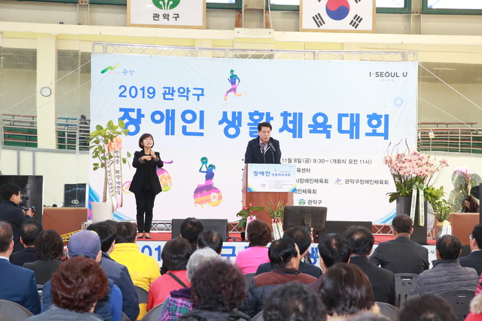 서울 관악구는 최근 관악구민 종합체육센터에서 장애 인식 개선과 장애인 체육 활성화를 위해 ‘2019 관악구 장애인 생활체육대회’를 개최했다. 이날 종목은 훌라후프, 게이트볼 등 다양하게 마련됐다. 사진은 박준희 구청장이 인사말을 전하는 모습. (사진제공=관악구청)