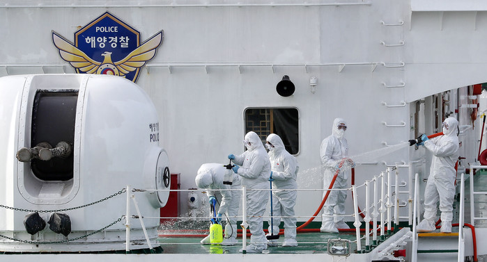 수도권에 코로나19 확진자가 속출한 9일 오후 인천시 중구 인천해경 전용부두에서 해양경찰들이 해경 함정을 소독하고 있다.