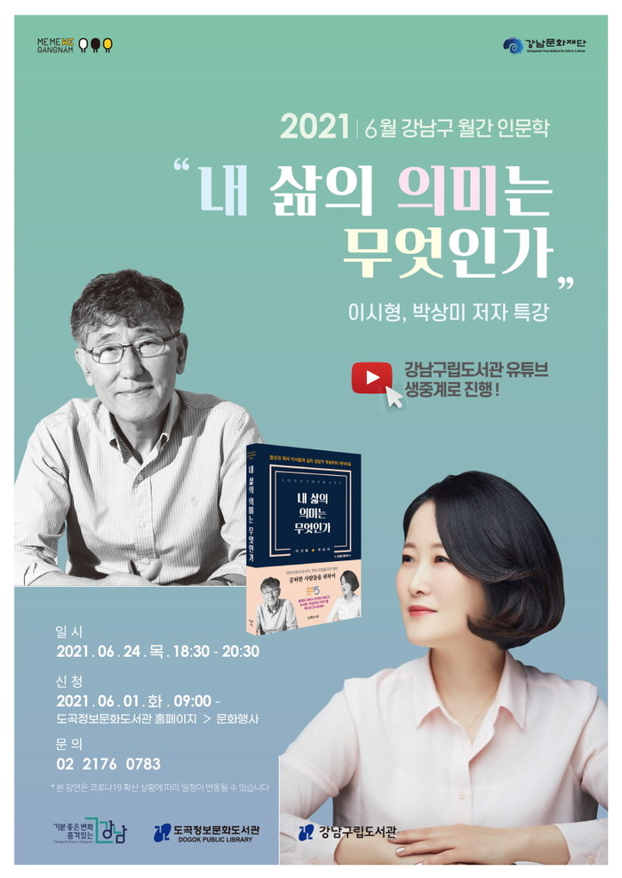 6월 강연 ‘내 삶의 의미는 무엇인가’는 동명의 공동저서를 주제로 공동 저자인 정신과 의사 이시형과 심리 상담가 박상미가 강연자로 선다. 외로움과 우울함, 공허함을 안고 살아가는 모두를 위해 저자의 임상경험을 토대로 스스로의 상태를 직면하고 치유를 위한 대화 등 나와 타인을 살리는 최고의 처방전에 대해 이야기 한다. 이번 강연의 오프닝 공연으로 강남심포니오케스트라의 연주도 함께할 예정이다.