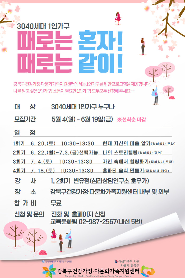 [시민일보 = 홍덕표 기자] 서울 강북구(구청장 박겸수)는 강북구건강가정·다문화가족지원센터 주관으로 3040세대 1인 가구를 위한 자기돌봄 프로그램 '때로는 혼자! 때로는 같이!'를 운영한다고 21일 밝혔다.