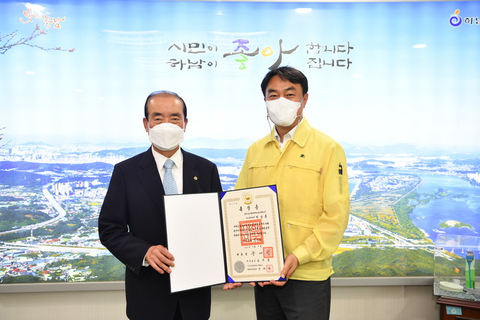 백남홍 경기 하남시민회 회장이 최근 청소년 범죄예방에 헌신한 공로를 인정받아 ‘범죄예방자원봉사 유공 정부포상 수여식’에서 법무부 장관으로부터 훈장을 전수받았다. 사진은 이날 김상호 시장(오른쪽)은 백남홍 회장에게 모란장 수훈을 축하하고 기념촬영을 하는 모습. (사진제공=하남시청)