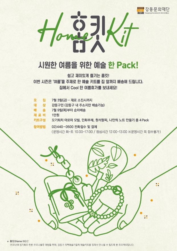 강동문화재단 관계자는 “코로나19 시기에 문화예술을 매개로 비대면 소통을 이루는 방안을 마련하기 위해 노력하고 있다”며 “여름을 맞아 알차게 구성한 ‘홈킷 시즌2’와 함께 집에서도 시원한 여름 휴가를 보내시길 바란다”고 말했다.