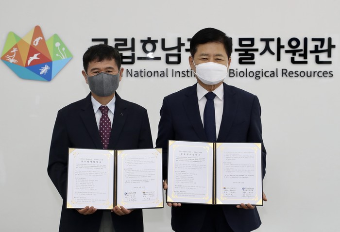 전남교육청과 국립호남권생물자원관이 25일 목포시 국립호남권생물자원관에서 '생물자원을 활용한 과학교육 활성화'를 위한 업무협약을 체결했다. 협약에 따라 양 기관은 생물다양성에 대한 기초지식 함양 및 미래 연구인력 양성에 기여하기 위한 초·중학생 진로체험 교육과 과학축전 등 지역사회와 함께하는 다양한 교육프로그램을 적극 발굴해 나갈 계획이다. 사진은 장석웅 교육감(오른쪽)이 관계자와 협약서를 들고 기념촬영을 하는 모습. (사진제공=전남도교육청)