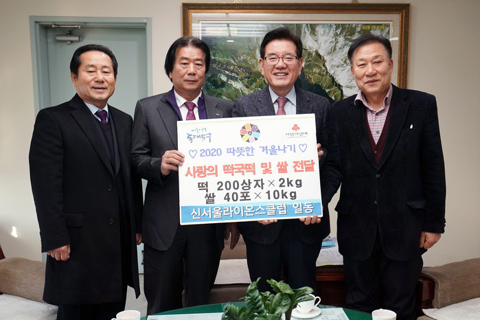 15일 서울 동대문구가 구청 5층 구청장실에서 ‘사랑의 떡국떡 및 쌀 전달식’을 열고 신서울라이온스클럽으로부터 떡국용 떡 200상자(2kg) ▲쌀 40포(10kg/포)를 기탁받았다. 사진은 유덕열 구청장(오른쪽에서 두 번째)과 신서울라이온스클럽 남후식 회장(왼쪽에서 두 번째) 및 관계자가 기념촬영을 하고 있는 모습. (사진제공=동대문구청)