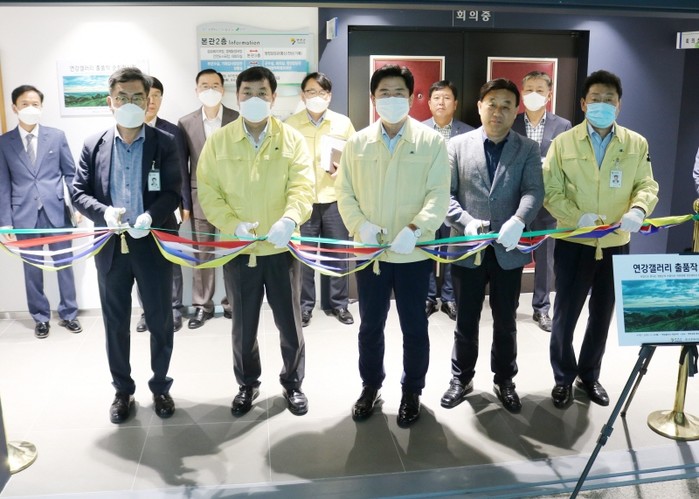 경기 연천군은 25일 군청 본관 2층 복도에서 ‘연강갤러리 출품작 사진 전시회’를 개최했다. 출품된 작품들은 한탄강과 임진강에서 볼 수 있는 아름다운 자연의 모습을 사진 앵글에 담고 있다. 사진은 관계자들이 테이프 커팅을 하는 모습. (사진제공=연천군청)