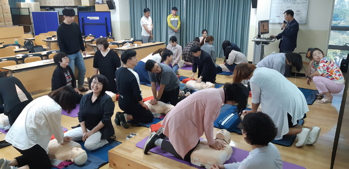 경기 동두천시 보건소는 30일 오후 1시30부터 4시간 동안 보건소 대회의실에서 지역내 의료기관 구급차 운전자 및 소방안전 관리자 등을 대상으로 '제8차 구조 및 응급처치 교육'을 실시했다. 사진은 심폐소생술 교육 진행 모습. (사진제공=동두천시청)