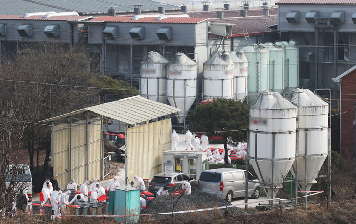 조류 인플루엔자(AI) H5형 바이러스가 검출된 경기 여주시의 한 산란계 농장에서 7일 관계자들이 살처분 작업을 준비하고 있다. 7일 조류인플루엔자(AI) 중앙사고수습본부와 경기도에 따르면 6일 오후 5시께 여주시의 한 산란계 농가에서 사육 중인 닭 1000여 마리가 폐사해 농장주가 AI 의심 신고를 했다. N형 타입과 고병원성 여부는 8일 오후 또는 오는 9일 오전에 결과가 나올 예정이다.