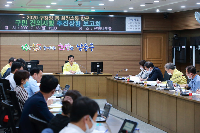 인천 남동구가 올해 초 현장에서 접수된 주민 민원의 추진사항을 점검하고 신속한 조치를 위한 방안 마련을 위해 13일 이강호 구청장 주재로 주요 간부 공무원이 참석한 가운데 '2020 구청장 동 현장소통 방문 상반기 건의사항 보고회'를 개최했다. 사진은 이 구청장이 보고회를 주재하는 모습. (사진제공=인천 남동구청)