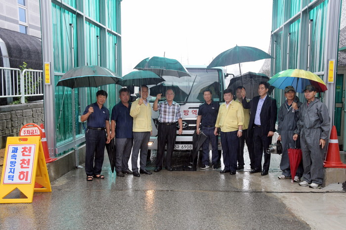 최용덕 경기 동두천시장은 12일 아프리카돼지열병 차단방역을 위해 설치된 '동두천시 상패동 농업기술정보센터' 거점소독시설을 방문해 방역현장 및 거점소독시설을 점검하고 방역관계자를 격려했다. 사진은 최 시장과 관계자들의 기념촬영 모습. (사진제공=동두천시청)