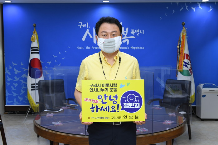 경기 구리시는 15일부터 구리문화원 주관으로 예절의 기본인 인사를 통해 서로 소통하고, 지역공동체를 회복해 소통과 화합으로 시민이 행복한 구리시를 만드는 '이웃사랑 인사 나누기 챌린지'를 진행한다. 사진은 안승남 시장이 챌린지에 동참하고 있는 모습. (사진제공=구리시청)