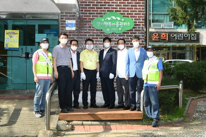 경기 구리시가 최근 교문동 가능골경로당 2층에 마련된 '구리시 경기행복마을관리소' 개소식을 열고 본격적인 운영에 들어갔다. 행복마을관리소에서는 지역밀착형 안전 순찰활동 등 지역의 안전을 도모하고, 생활공구 대여 서비스 등 생활편의를 지원한다. 사진은 개소식에 참석한 안승남 시장(왼쪽 네 번째)과 관계자들이 기념촬영을 하는 모습. (사진제공=구리시청)
