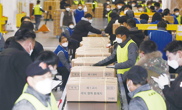 30일 오전 세종시의 한 인쇄공장에서 인수책임자 및 관계 직원, 중앙협력관 등이 2021학년도 대학수학능력시험용 문제지와 답안지를 전국 시험 지구별로 배부하고 있다.