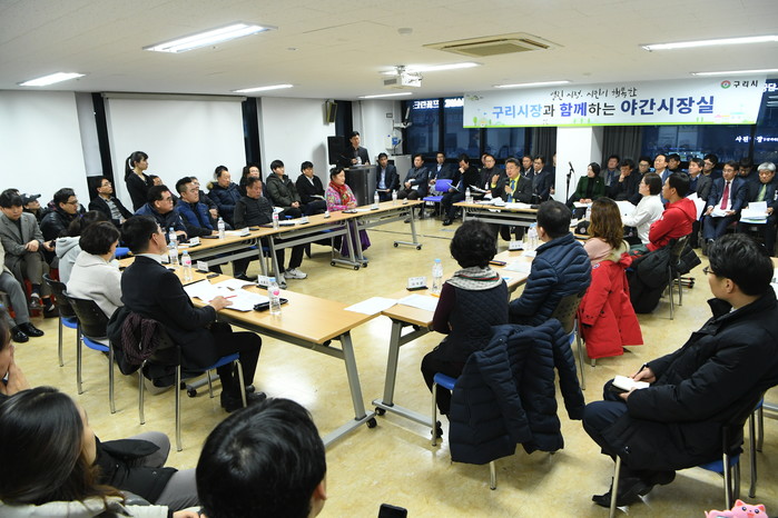 안승남 경기 구리시장이 최근 갈매동행정복지센터에서 시간을 내기 어려운 일반 시민들과 직장인들을 위해 '찾아가는 야간시장실'을 열고 지역 주민들의 다양한 의견을 청취하며 소통하는 시간을 보냈다. 사진은 안 시장이 주민들과 이야기하는 모습. (사진제공=구리시청)