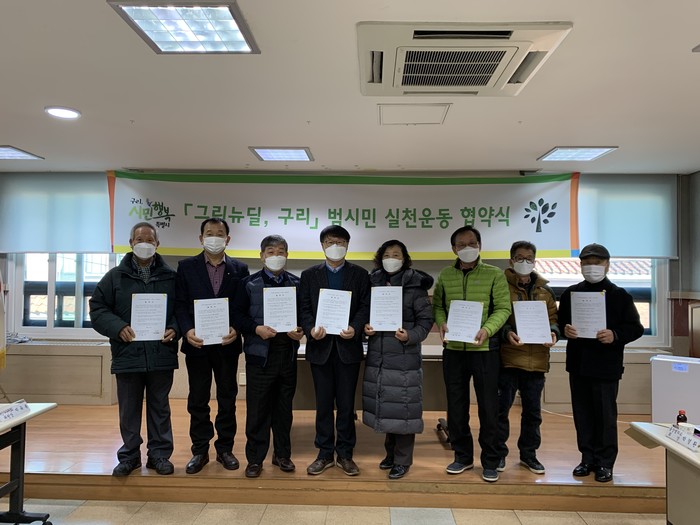 경기 구리시 수택1동이 최근 지역사회보장협의체, 6개 기간단체, 13개 경로당과 함께 '그린뉴딜, 구리' 협약을 체결했다. 이날 협약에 따라 협약 단체들은 온실가스배출 감소를 위한 일회용품 사용 억제를 위해 개인 텀블러 사용, 생활 속 자전거 타기 등에 앞장설 것을 결의했다. 사진은 관계자들이 기념촬영을 하는 모습. (사진제공=구리시청)