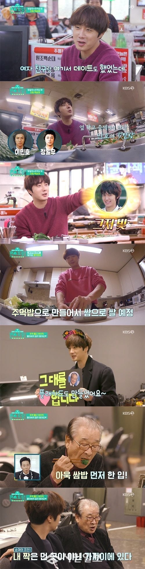 이날 정일우는 고교시절 자주 다녔던 신림동 순대촌을 찾았다. 정일우는 "예전에는 백순대 중간에 단무지 위에 양념장을 올려줬는데"라고 이야기 했고, 사장님은 "요즘은 깻잎에 올려준다"라며 바뀐 시스템을 소개해 눈길을 끌었다.