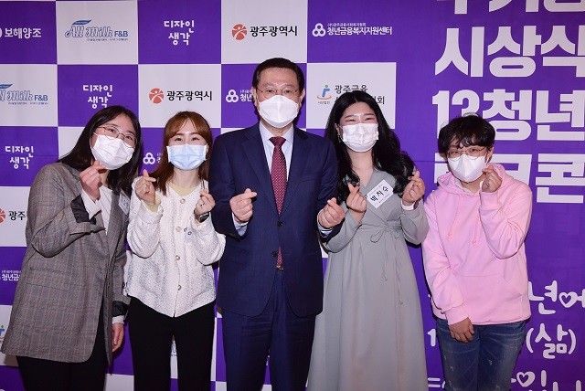 | ▲ 이용섭 광주광역시장이 12일 오후 남구 양림동에 위치한 문화공간 '10년후그라운드'에서 열린 청년13(일+삶)통장 수기공모전 시상식에 참석해 청년들과 기념촬영을 하고 있다./광주광역시 제공 |