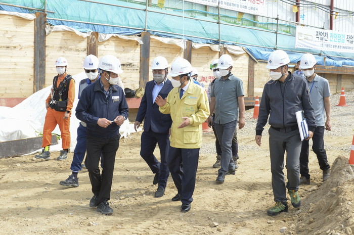 경기 포천시는 19일 국지성 집중호우와 태풍 등 자연재난에 대한 선제적 대응책 마련을 위해 읍면동장 긴급회의를 열고, 반복 피해지역 및 공사현장 등 위험지역에 대한 대책과 재난예방사업추진 현황 등을 점검했다. 사진은 박윤국 시장(가운데)이 지역내 공사현장을 점검하고 있는 모습. (사진제공=포천시청)