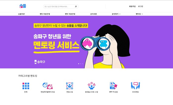 | ▲ 송파 취·창업 멘토링 플랫폼 ‘송풀’ 홈페이지 첫 화면. |