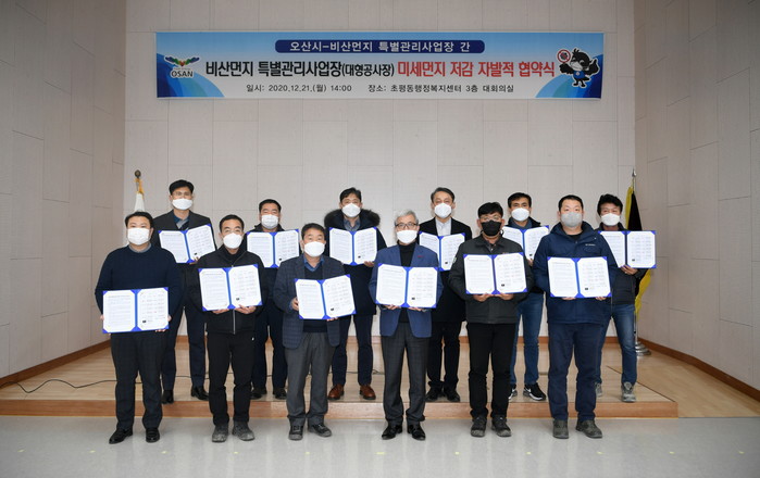 경기 오산시가 21일 초평동행정복지센터 대회의실에서 지역내 12개 특별관리사업장의 현장대리인들과 함께 미세먼지 감축 공동 협약을 체결했다. 협약의 주요내용은 건설현장 내 소각금지, 주변도로 살수, 노후화 건설기계 사용금지 등이다. 사진은 곽상욱 시장(앞줄 왼쪽 네 번째)이 관계자들과 협약서를 들고 기념촬영을 하는 모습. (사진제공=오산시청)