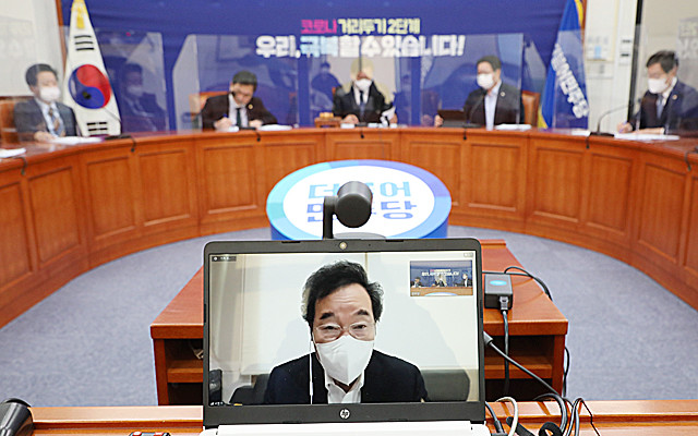 더불어민주당 이낙연 대표가 30일 오전 서울 여의도 국회에서 열린 최고위원회의에 화상으로 참석해 발언하고 있다.