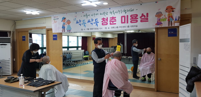 서울 중랑구 면목3·8동 주민센터에서 지난 2일 지역 저소득 노인을 위한 ‘싹둑싹둑 청춘 미용실’을 열고, 미용협회 소속 이·미용사 자원봉사자들의 재능기부를 통해 18명의 노인에게 이·미용 서비스를 제공했다. 사진은 이날 자원봉사자들이 노인들의 머리를 다듬고 있는 모습. (사진제공=중랑구청)