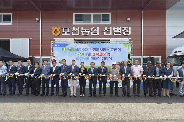 경기 포천시가 지원하고 포천농협이 개최하는 로컬푸드 직매장 및 반가공사업소 준공식이 8일 신북면 가채리에 위치한 포천농협 반가공사업소에서 개최됐다. 사진은 행사에 참석한 박윤국 시장(오른쪽 열 번째)을 비롯해 관계자들이 테이프 커팅을 하고 있는 모습. (사진제공=포천시청)