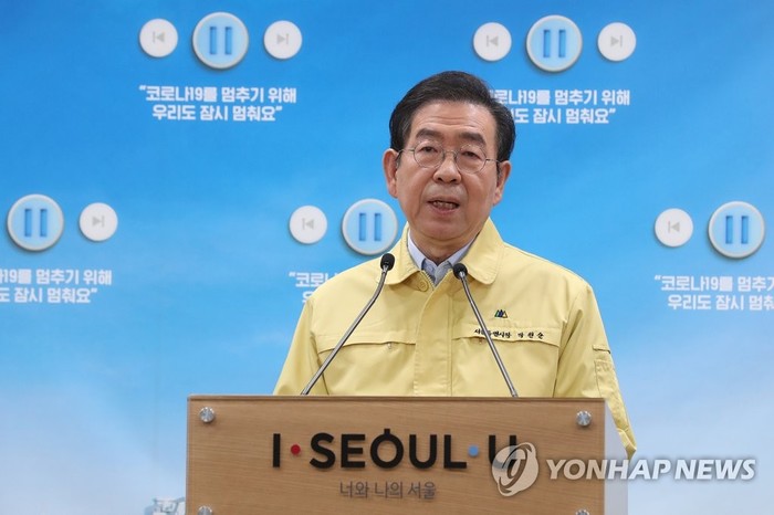 ▲ 박원순 서울시장이 10일 오전 서울시청 브리핑룸에서 코로나19 관련 온라인 브리핑을 하고 있다. (사진제공=연합뉴스) |